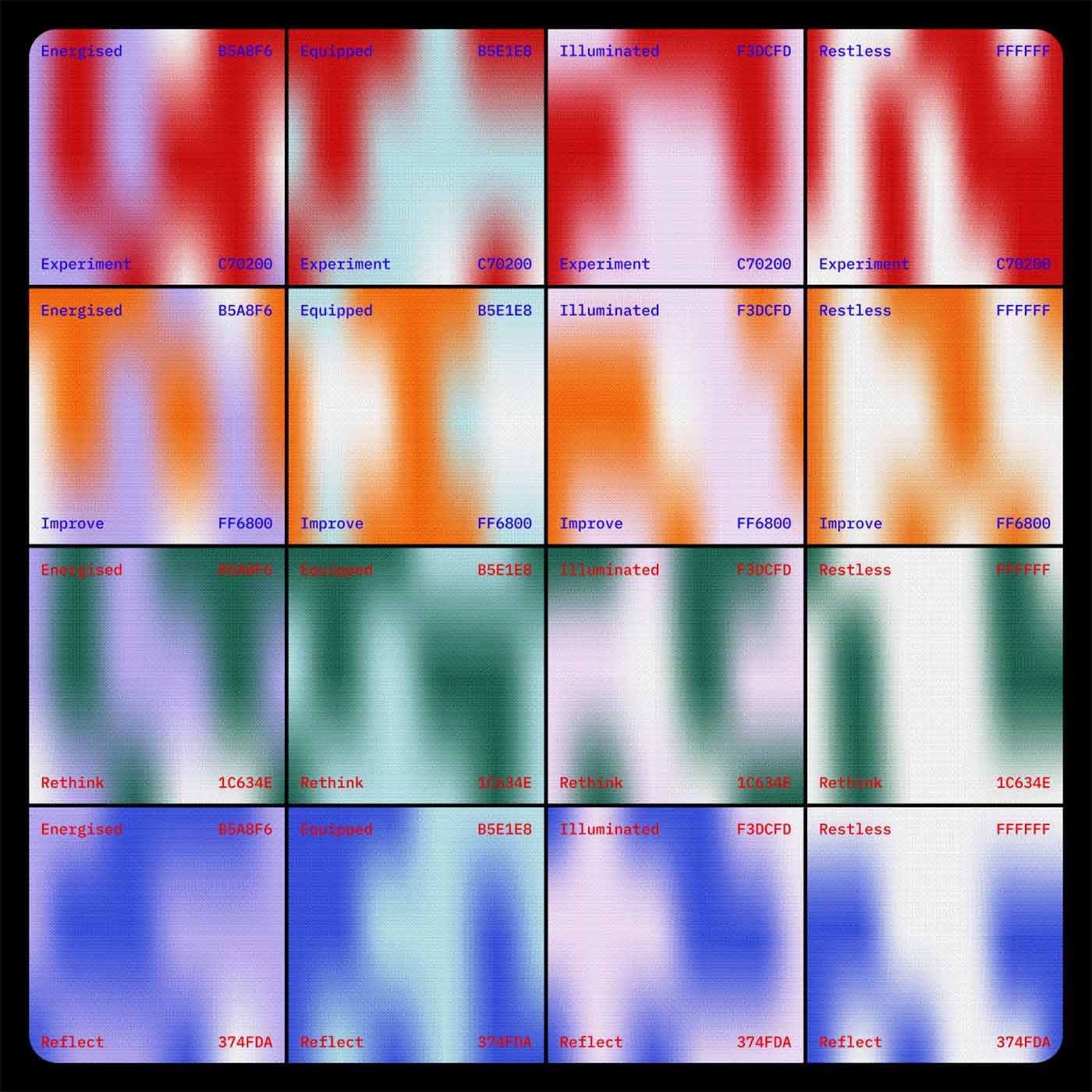 The second analysis, qualitative in nature, focuses on the impact of the words on the listeners. At the end of the talk, the audience is invited to answer two questions: “What was the most immediate effect this talk had on you?” and “What is the next step you feel you want to take?”. Both questions offer four possible answers, and for each question, we define a palette, encoding a color for every response. The color combination that forms the background of the landscape is the final result of the survey, derived from the two answers that garner the majority of votes (one per question), for a total of 16 possible combinations.