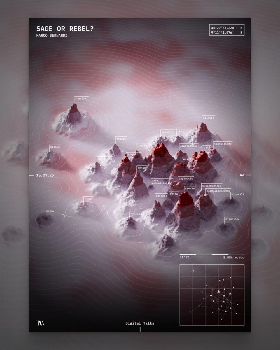 To illustrate the process behind this experiment, we will discuss the composition we created for Marco Bernardi, a data visualization expert. His talk focused on the distinction between the “sage” and the “rebel”—two archetypes of visual and design thinking.